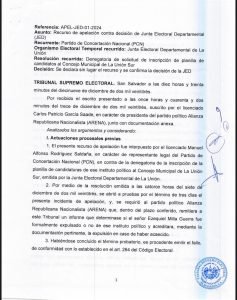 El representante legal del PCN, Manuel Rodríguez Saldaña, presentó una solicitud para apelar a la petición de denegatoria de la inscripción de la planilla de candidaturas del instituto político al Concejo Municipal de La Unión Sur, emitida por la Junta Electoral Departamental de La Unión, el pasado.