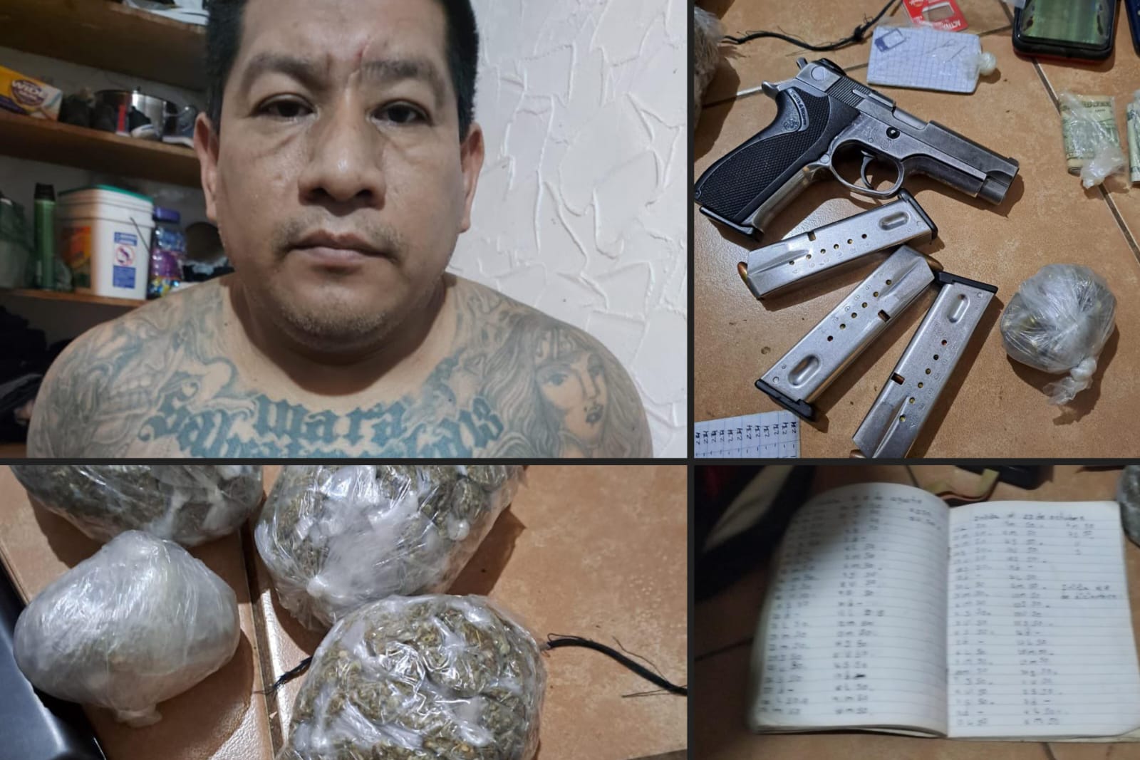 En el procedimiento se le incautó una pistola, junto tres cargadores, cinco celulares, marihuana, dinero en efectivo, y un cuaderno, el presuntamente posee apuntes “del cobro de extorsión”.