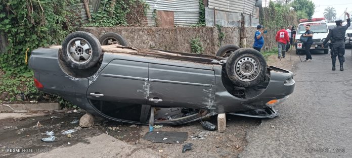 Según el informe de la Policía Nacional Civil (PNC), un vehículo chocó con otro y volcó, a causa de la imprudencia al conducir.