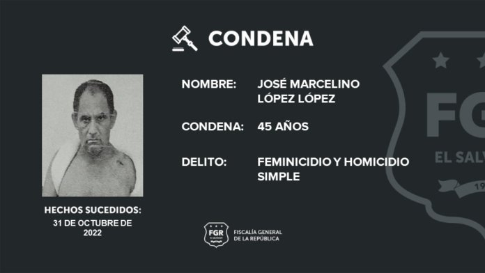 El Juzgado Especializado de Sentencia para una Vida Libre de Violencia y Discriminación para las Mujeres, de San Salvador condenó a la pena de 30 años de prisión a José Marcelino López López por el feminicidio simple de su esposa quien era de 46 años y a 15 años de prision por el homicidio simple de Rufino Leiva.