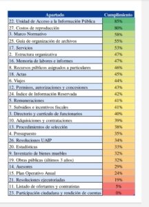 Las áreas de información que reflejan bajo cumplimiento son la divulgación de informes relativos a finanzas, gestión de recursos.