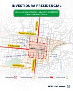 Este miércoles, el Viceministerio de Transporte (VMT) informó sobre cierres programados con motivo de la investidura del Presidente Nayib Bukele, a realizarse en la Plaza Gerardo Barrios, en el Centro Histórico Capitalino.