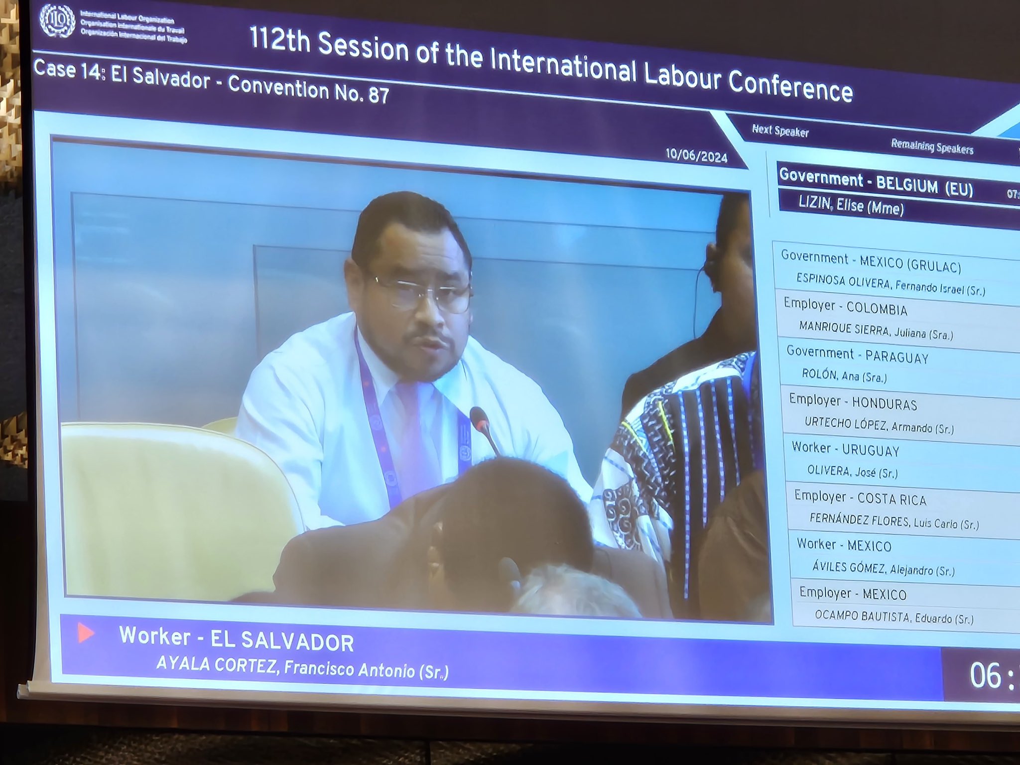 Castro agradeció al representante de los trabajadores de El Salvador ante la OIT, Francisco Ayala, por su intervención, en la que, dijo el ministro, se expuso el papel de la Asociación Nacional de la Empresa Privada (ANEP) en la política salvadoreña, desde la postulación de candidatos presidenciales hasta la nominación de ministros en gabinetes pasados.