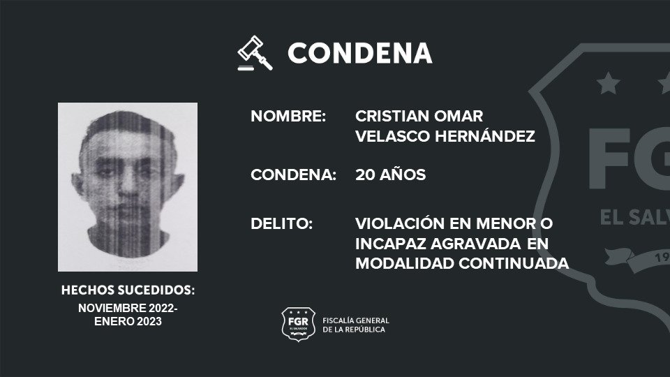 El Tribunal de Sentencia de Sensuntepeque condenó a 20 años de prisión para Cristian Omar Velasco Hernández, por el delito de abuso sexual a una menor de edad.