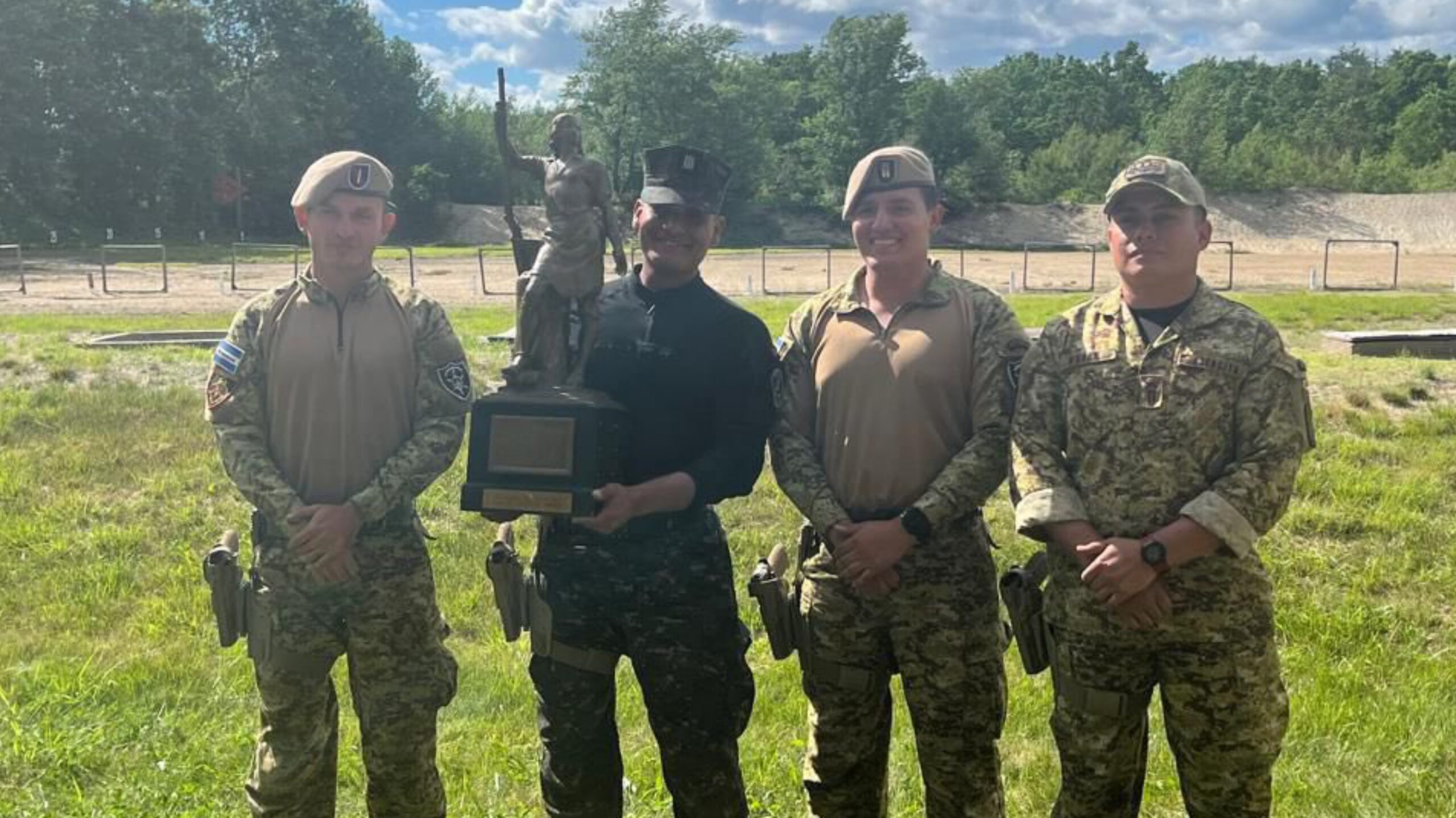 El Ministro de Defensa, René Francis Merino Monroy, anunció que los elementos de la Fuerza Armada, Diego Ricardo Cuéllar Ramírez, José Raúl Morán Rodríguez, Roberto Santiago Torres Alfaro y Jaime Eduardo Peraza Orantes ganaron el trofeo Remington Centennial, obteniendo el primer lugar por equipos en la Competencia de Puntería 2024 de la Guardia Nacional de New Hampshire, llevada a cabo en Fort Devens, Massachusetts, en Estados Unidos.
