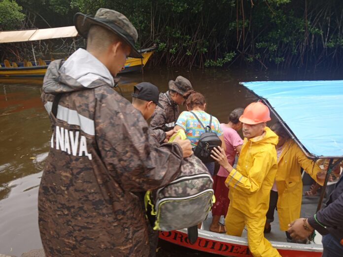 Personal de la Marina Nacional apoya a otras instituciones de servicio, en la evacuación preventiva de 10 personas de la Isla El Jobal hacia un albergue de Puerto El Triunfo, Usulután.