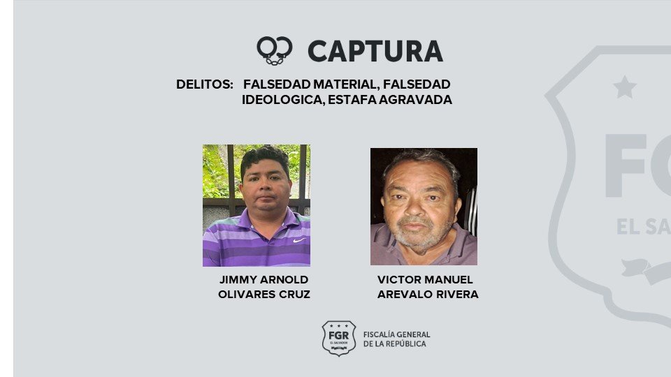 La Fiscalía General de la República (FGR) ordenó la detención de Víctor Manuel Arévalo Rivera y Jimmy Arnold Olivares Cruz, acusados de despojar de sus propiedades a varias personas en Tamanique y Zaragoza, La Libertad.