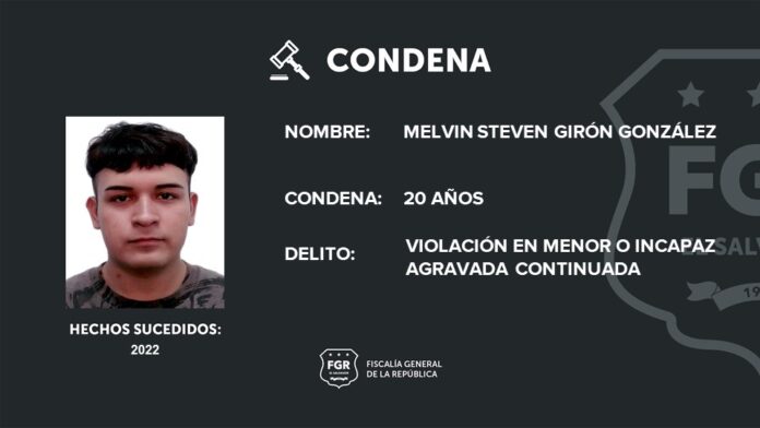 Melvin Steven Girón González fue condenado a 20 años de cárcel por el delito de violación en menor o incapaz, bajo la modalidad continuada, hecho ocurrido en 2022 en el departamento de Chalatenango.