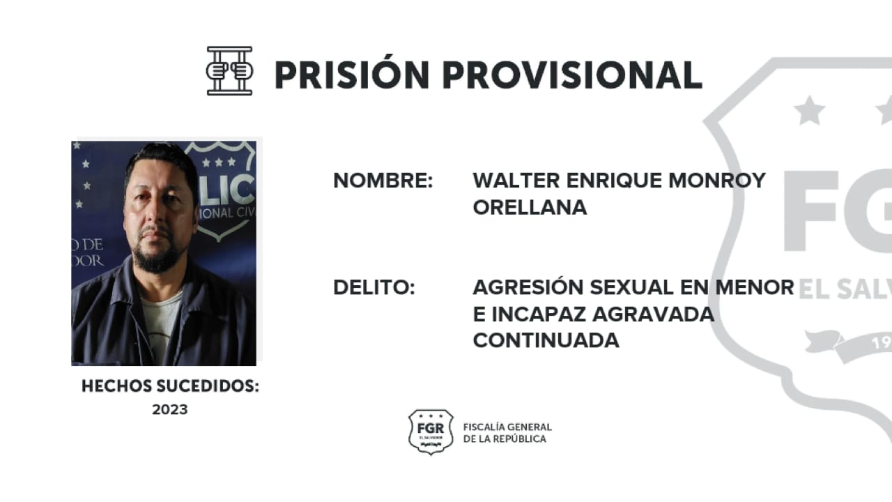 Tras la Audiencia Inicial, la Fiscalía General de la República (FGR) ha logrado que Walter Enrique Monroy Orellana permanezca en detención provisional, acusado de agredir sexualmente a una niña de 11 años de edad.
