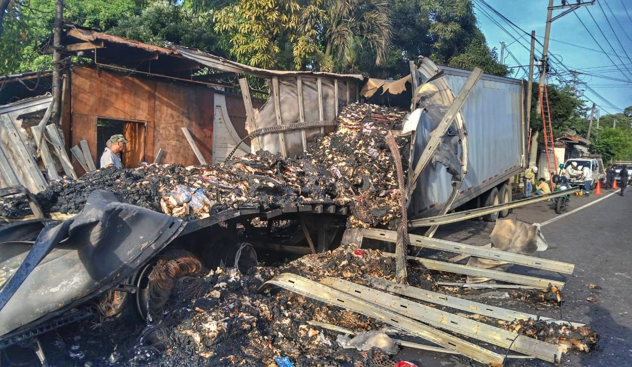 Según el informe de la Policía Nacional Civil (PNC), un camión en el cual se trasladaba pan, se incendió tras colisionar contra un vehículo tipo sedán.
