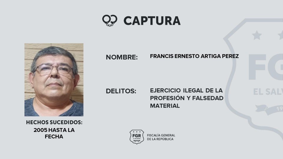 La Fiscalía General de la República (FGR) ordenó la captura de Francis Ernesto Artiga, acusado de ejercer como médico sin contar con título universitario ni registro en el Consejo Superior de la Salud Pública.