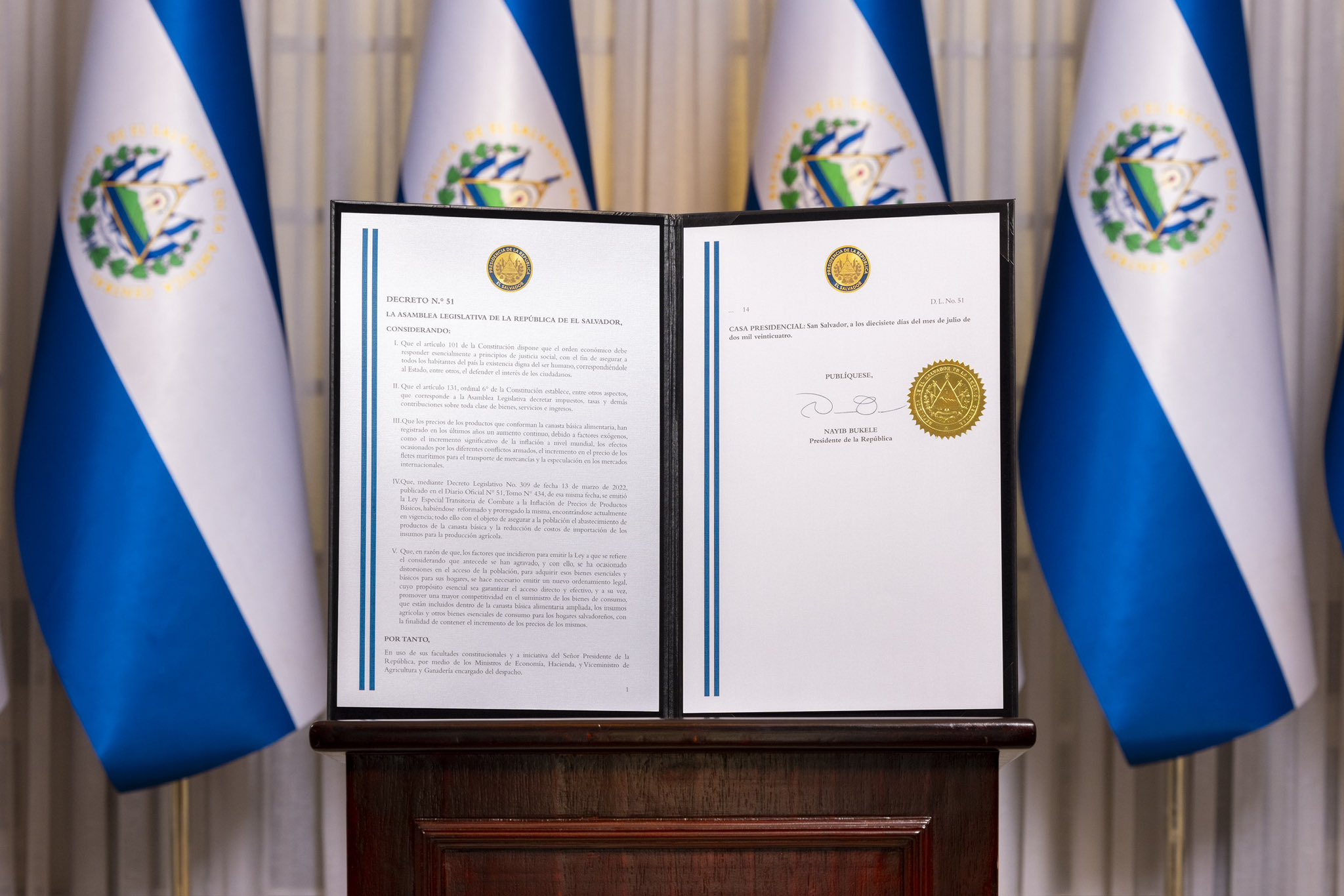 Este martes, el Presidente de la República, Nayib Bukele, sancionó la Ley Especial para Promover Competitividad y Facilitar Acceso a Productos de la Canasta Básica Ampliada, con la cual se busca eliminar los aranceles a la importación de alimentos e insumos agrícolas para reducir los precios y beneficiar a las familias salvadoreñas y a los productores nacionales.