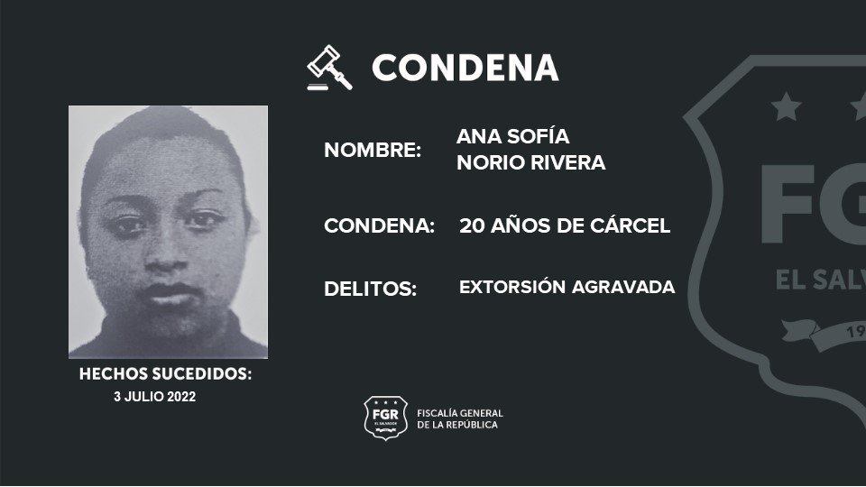 Ana Norio Rivera, vinculada a la pandilla 18 Revolucionarios, fue condenada a 20 años de cárcel, por extorsionar a varios comerciantes de Apopa, en San Salvador Oeste.