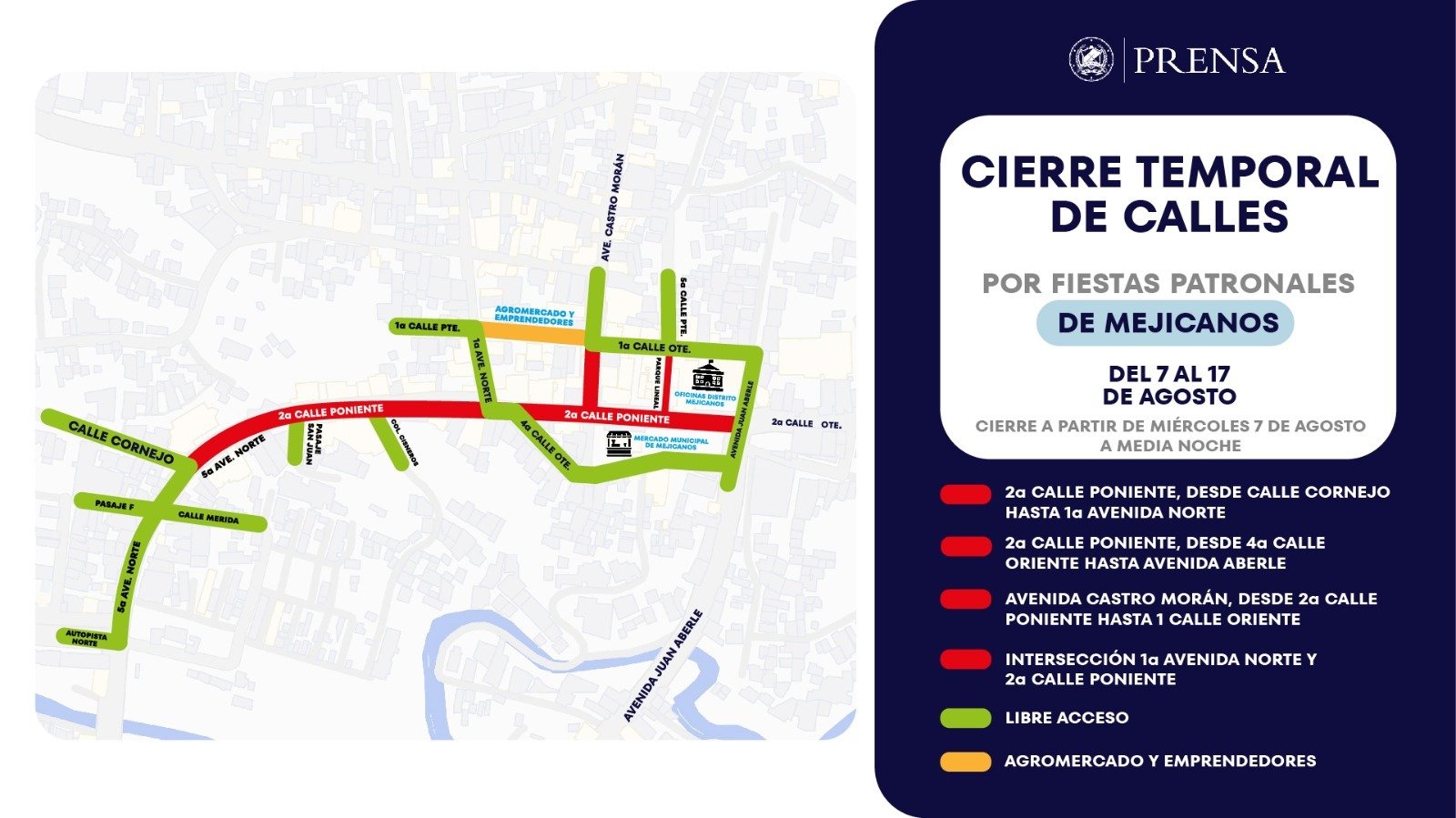 En el marco de la celebración de las fiestas patronales en Mejicanos, en honor a la Virgen de la Asunción, algunas áreas del distrito estarán cerradas al tráfico, desde este miércoles hasta el 16 de agosto.