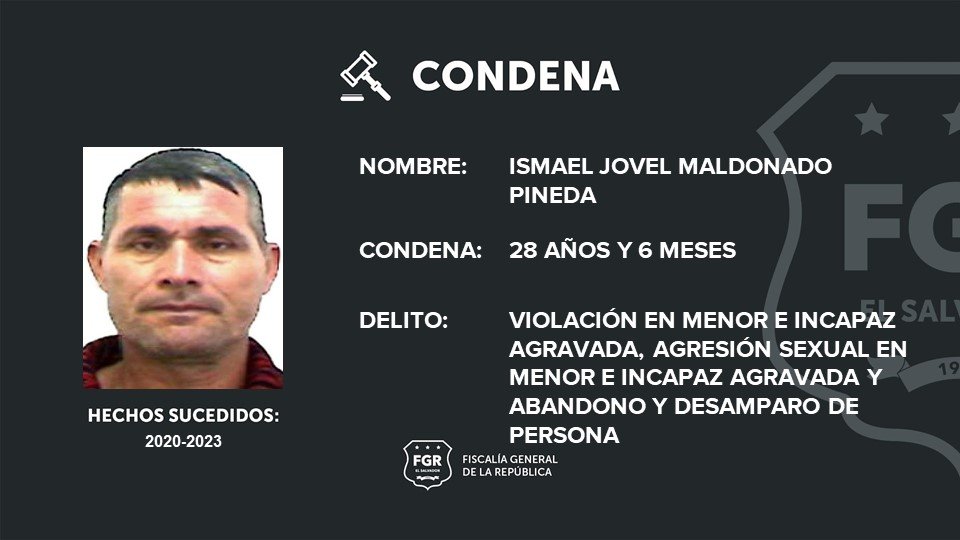 La Fiscalía General de la República (FGR) informó sobre la condena de 28 años de cárcel contra Ismael Jovel Maldonado Pineda por cometer delitos sexuales en contra de 2 niñas de 13 y 6 años de edad.