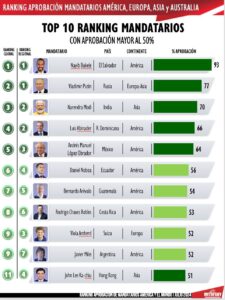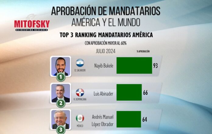 Entre los mandatarios más destacados, resaltan: Nayib Bukele (El Salvador), quien encabeza el ranking con un 93% de aprobación, consolidándose como el líder más popular tanto en América como a nivel mundial. Le siguen Luis Abinader de República Dominicana, con un 66% de aprobación, ocupa el segundo lugar en América y Andrés Manuel López Obrador (México) Con un 64%, se sitúa en el tercer lugar del continente.