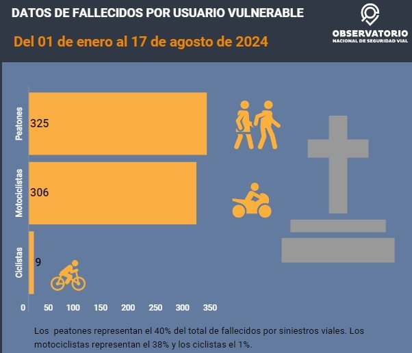 El informe destaca que los peatones representan el 40% del total de muertes por siniestros viales, los motociclistas el 38% y los ciclistas el 1%.