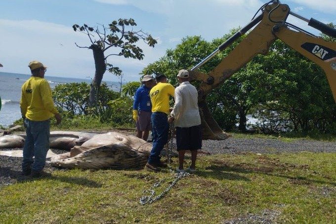 Además, durante la tarde, con el apoyo del Ministerio de Obras Públicas, se retiraron los restos de otra ballena varada en la playa Los Cóbanos, también en Acajutla.