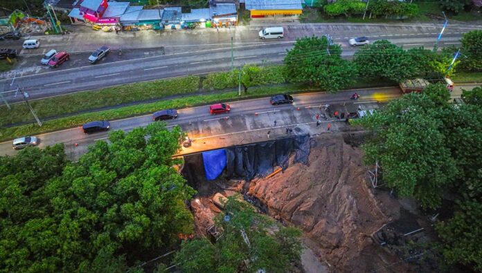 El director de Fovial indicó que la situación fue ocasionada durante las lluvias reportadas hace varias semanas que provocaron el colapso de una importante tubería de aguas lluvias de 60 pulgadas, que pasa por la rampa de salida del lugar conocido como “El Pupusodromo”, por lo que realizan un procedimiento de empuje de tubería de 60 pulgadas para no romper el pavimento de la vía.