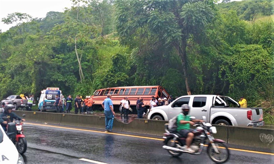 La Policía Nacional Civil (PNC) informó que el conductor de un bus perdió el control, chocando con los separadores de la vía antes de caer en una cuneta.