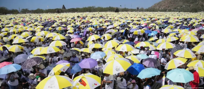 Recibieron al papa una marea de paraguas amarillos y blancos, los colores del Vaticano, donados por los organizadores para reguardarse del excesivo calor.