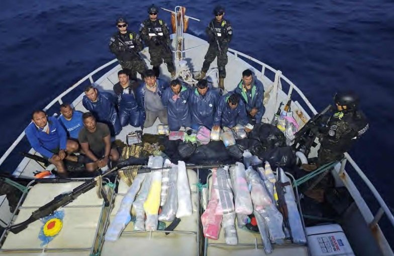 Los sospechosos viajaban a bordo de tres embarcaciones que transportaban 50 bultos con 1,258 kilos de cocaína, además de 20 fusiles tipo AK-47, 12 carabinas, una ametralladora M60, un rifle calibre .50, municiones y cargadores.