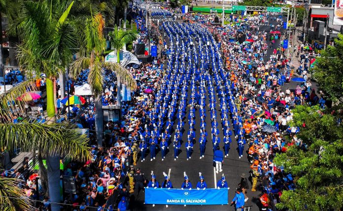 Desde temprano, familias salvadoreñas se concentraron en la Plaza Salvador del Mundo para presenciar el inicio del desfile, que comenzó a las 8:00 de la mañana, con la participación de la Banda El Salvador, compuesta por 1,000 jóvenes, quienes entonaron melodías patrióticas en un homenaje a la nación.