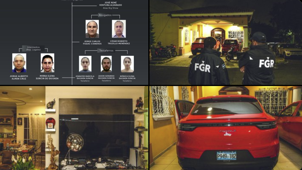 Los inmuebles allanados están ubicados en Santa Tecla, La Libertad y en la colonia San Francisco, San Salvador. Durante el registro se incautaron $13,844.00 dólares, celulares, computadoras, un arma de fuego y documentos que vinculan a Quijada Orellana en los ilícitos. Uno de los allanamientos se lleva a cabo en un apartamento ubicado en la colonia San Francisco, San Salvador. El inmueble pertenece a Jennifer Maricela Quijada Suncin, hija de de Gerardo Quijada. La imputada servía como testaferro dentro de la estructura, según la FGR.
