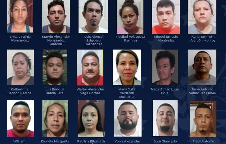 Los capturados son: Erika Virginia Hernández, Marvin Alexander Hernández Alarcón, Luis Alonso Salguero Hernández, Rosibel Velásquez Ramírez, Miguel Ernesto Menéndez, Karla Yamileth Alarcón Monroy, Katherine Leonor Medina, Luis Enrique Garcí, Walter Alexander Vega Gómez, María Julia Calderón, Jorge Elmer Luna, René Antonio Velásquez, William Alexander García Pacheco, Dloneli Margarita Lima Aguirre, Paulina Elizabeth Solano Agreda, Yonis Alexander Sura Chávez, José Giancarlo Turcios Sura, Fredi Antonio Mojica Recinos, Delmi Ermida Hernández Reina, Nimrod Eliézer Miranda Zúniga, Romel Alexander Vaquero Torres y Salvador de Jesús Flores Ramos.