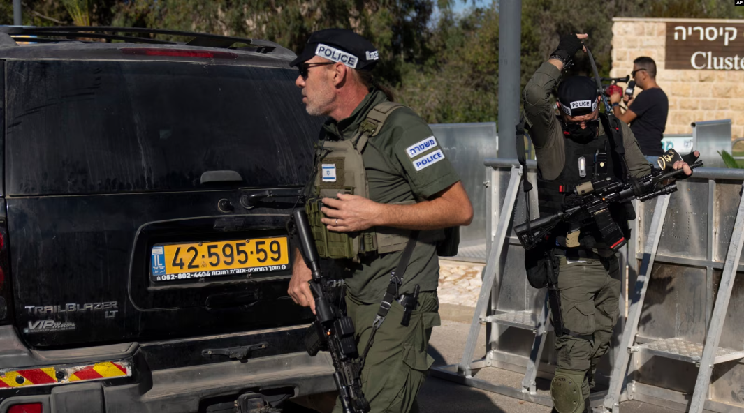 Fuerzas de seguridad israelíes patrullan una calle luego de que, según el gobierno, se disparó un dron contra la vivienda del primer ministro, Benjamin Netanyahu, en Caesarea, Israel, el 19 de octubre de 2024. Foto: Cortesía.