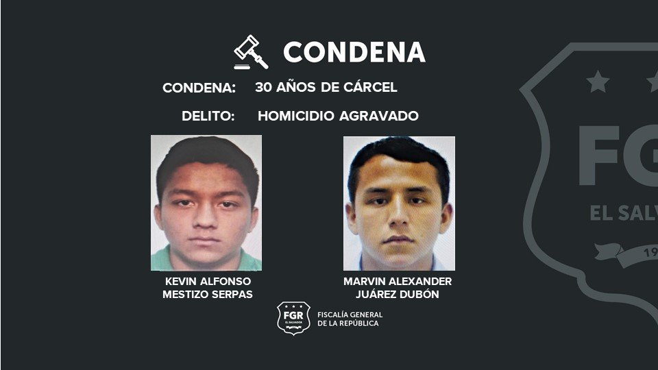 El Tribunal 4º de Sentencia de San Salvador condenó a 30 años de prisión a Marvin Alexander Juárez Dubón y Kevin Alfonso Mestizo Serpas, miembros del Barrio 18, por asesinar a dos empleados de una barbería en Cuscatancingo, San Salvador Centro.