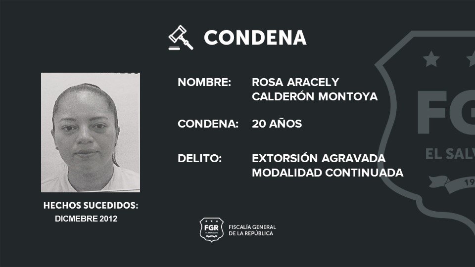Rosa Aracely Calderón Montoya ha sido condenada a 20 años de prisión por el Tribunal Segundo de Sentencia de Santa Ana, acusada de extorsionar a un comerciante en Metapán. La sentencia fue dictada en ausencia de Calderón.