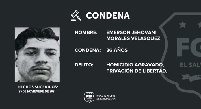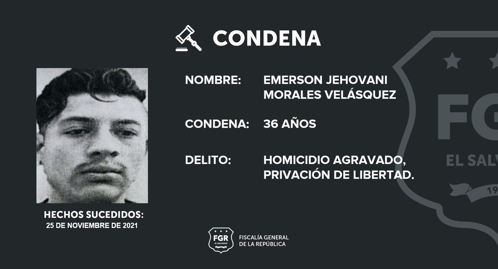 Emerson Morales fue sentenciado a 36 años de prisión tras ser declarado culpable de asesinar a una persona y privar de libertad a otra persona en San Pedro Perulapán, Cuscatlán, en noviembre de 2021.