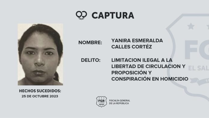 Yanira Esmeralda Calles Cortez fue detenida por orden de la Fiscalía General de la República (FGR) tras ser acusada de limitación ilegal a la libertad de circulación y proposición y conspiración en delito de homicidio agravado.