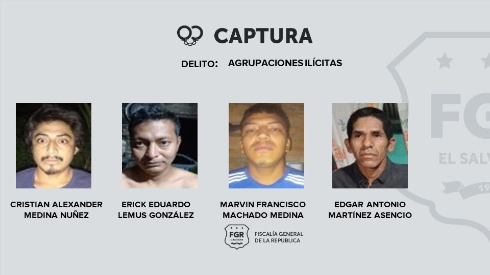 Hasta el momento los capturados son: Cristian Alexander Medina Núñez, Erick Eduardo Lemus González, Marvin Francisco Machado Medina, Edgardo Antonio Martínez Asencio, Elvis Isael Ochoa Gutiérrez, Cecilia Beatriz Torres Pérez, José Vladimir Díaz Benítez, Juan Fernando Esquivel Clemente, Kevin Ovidio Díaz Menjivar, Juan Carlos Asencio Catota, Josselyn Karina Marroquín Martínez, Emerson Salvador García González.
