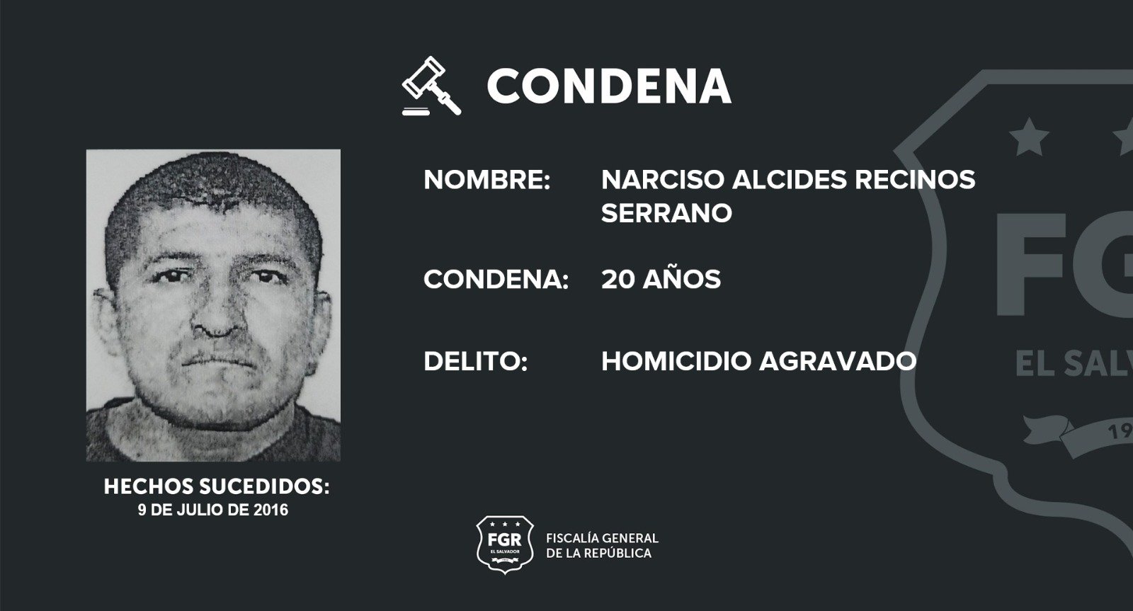 La sentencia se dictó en contra de Narciso Alcides Recinos Serrano, procesado en ausencia, tras comprobarse su culpabilidad en un caso ocurrido en Suchitoto, Cuscatlán.