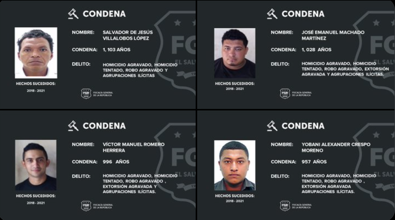 Algunos de estos sujetos fueron condenados por el Tribunal Segundo Contra el Crimen Organizado de San Miguel, en ausencia gracias a las reformas del Código Procesal Penal.