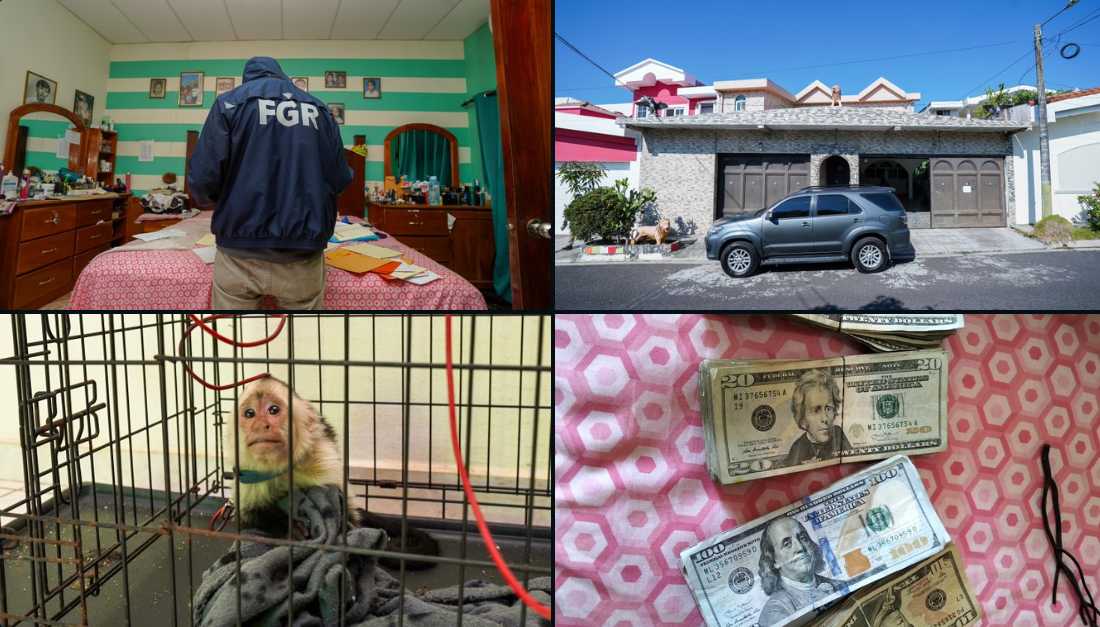 Uno de los punto que se intervino es una vivienda ubicada en una residencial de Santa Tecla, en donde se incautó dinero en efectivo, armas de fuego, aparatos informáticos, vehículos, documentos y un mono capuchino, especie en peligro de extinción, en condiciones deplorables.