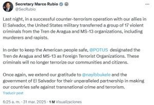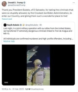 El presidente de los Estados Unidos, Donald Trump, reaccionó en la red social X al traslado de 17 presuntos miembros de las organizaciones criminales Tren de Aragua y MS-13 a El Salvador, donde serán recluidos en el Centro de Confinamiento del Terrorismo (CECOT).