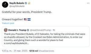 Por su parte, el presidente salvadoreño Nayib Bukele confirmó la operación en X: «Todos los individuos son asesinos confirmados y delincuentes de alto perfil, incluidos seis violadores de menores». Bukele respondió además a Trump con un mensaje de agradecimiento: «Agradecido por sus palabras, presidente Trump. ¡Adelante juntos!».