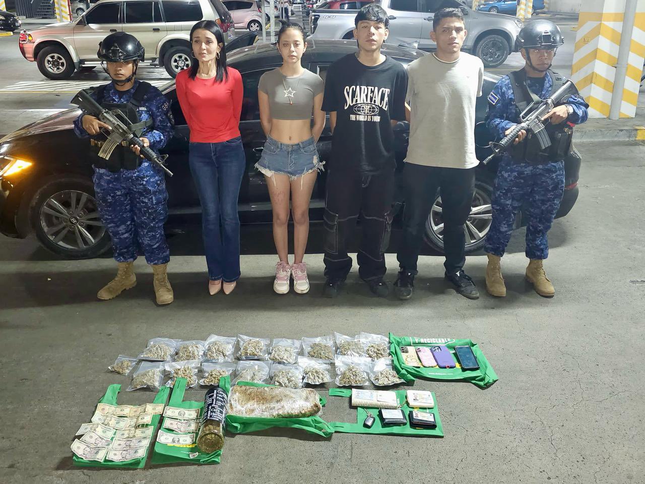 Cuatro personas fueron detenidas este miércoles por elementos de la Fuerza Armada, tras ser sorprendidas en posesión de droga al interior de un vehículo estacionado en un centro comercial de San Salvador.