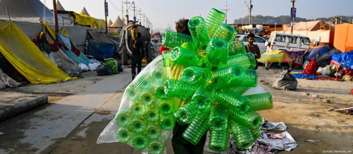 Una persona con multitud de botellas de plástico colgadas de la espalda. Imagen de referencia. Foto: Cortesía.
