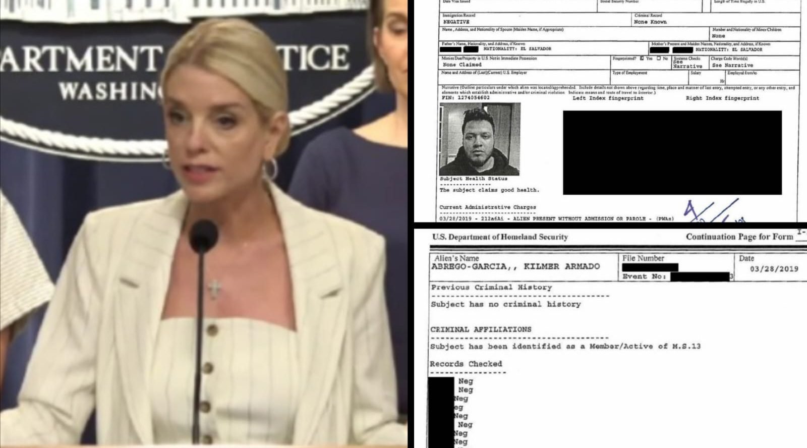 Bondi subrayó que la decisión judicial tomada en 2019, que validó la pertenencia de Abrego-García a la pandilla MS-13, fue sostenida por un tribunal de inmigración y un juez de apelación.