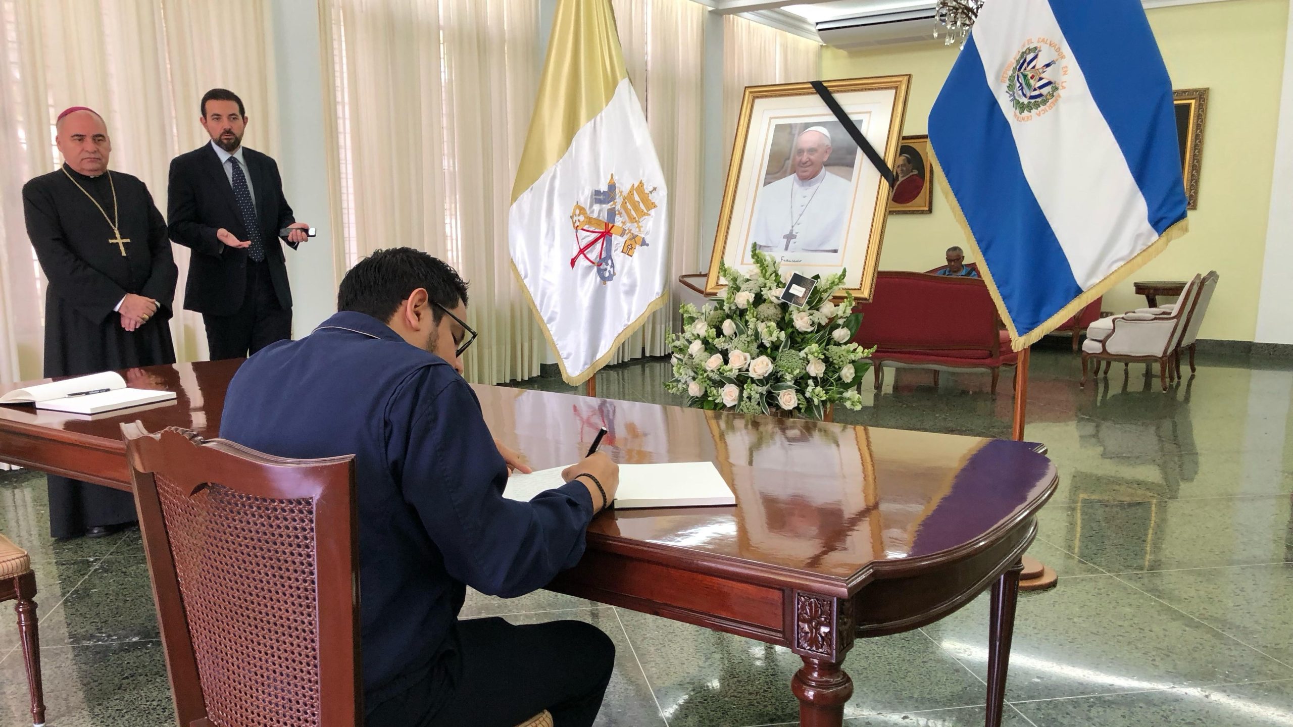 La Nunciatura Apostólica en El Salvador ha habilitado un libro de condolencias para que los representantes diplomáticos, líderes religiosos y la ciudadanía en general puedan expresar su pesar por el fallecimiento de Su Santidad el Papa Francisco. Desde tempranas horas, miembros del cuerpo diplomático acreditado en el país se han hecho presentes en la sede de la representación vaticana para manifestar su solidaridad con la Iglesia Católica ante la pérdida del sumo pontífice.