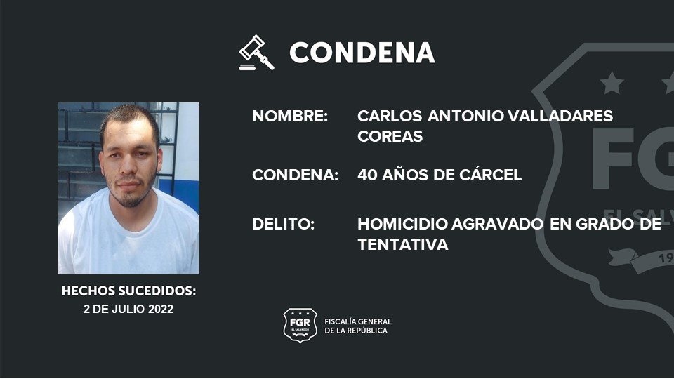 Carlos Valladares fue condenado a 40 años de prisión por intentar asesinar a dos agentes de la Policía Nacional Civil (PNC) durante un patrullaje en la zona de Santa Tecla, informó este jueves la Fiscalía General de la República (FGR).