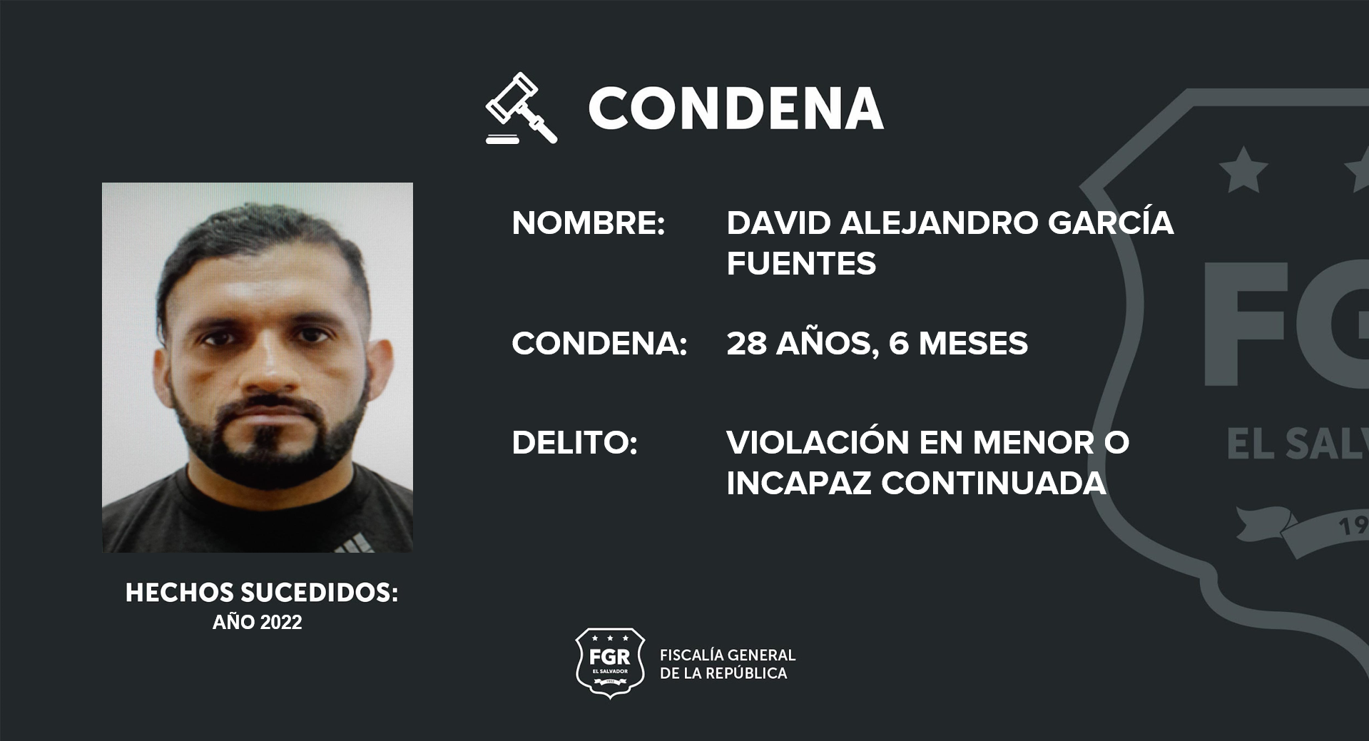 David Alejandro García Fuentes, imputado presente, fue condenado a 28 años y 6 meses de prisión por el delito de violación en menor o incapaz en modalidad continuada. Las pruebas presentadas en juicio por la fiscalía permitieron declarar al imputado culpable.