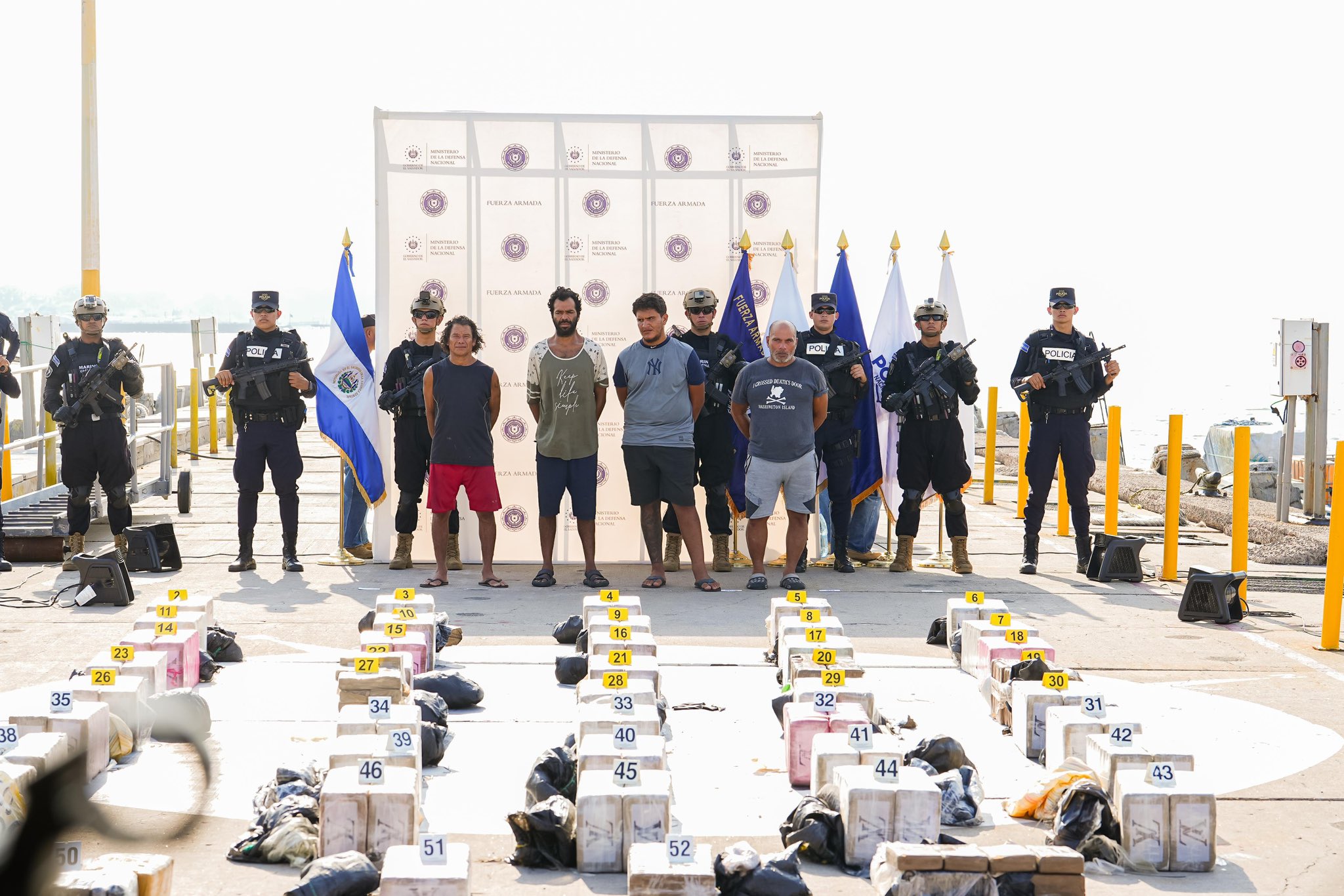 El Gabinete de Seguridad presentó este miércoles el decomiso de aproximadamente una tonelada de cocaína y armas de fuego, valorados en más de $25.6 millones de dólares, incautados en un operativo ejecutado por la Fuerza de Tarea Naval Tridente a 570 millas náuticas al suroeste de la Bocana El Cordoncillo, en el Estero de Jaltepeque.