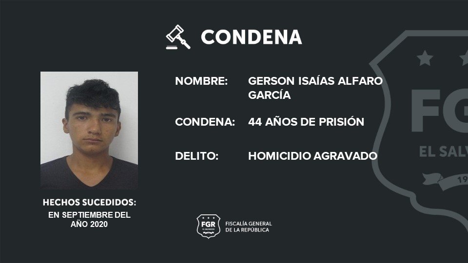 Gerson Isaías Alfaro García, miembro de la pandilla MS, fue condenado a 44 años de prisión tras ser declarado culpable como coautor de un doble homicidio ocurrido en el cantón San José Los Almendros, distrito de Apastepeque, departamento de San Vicente.