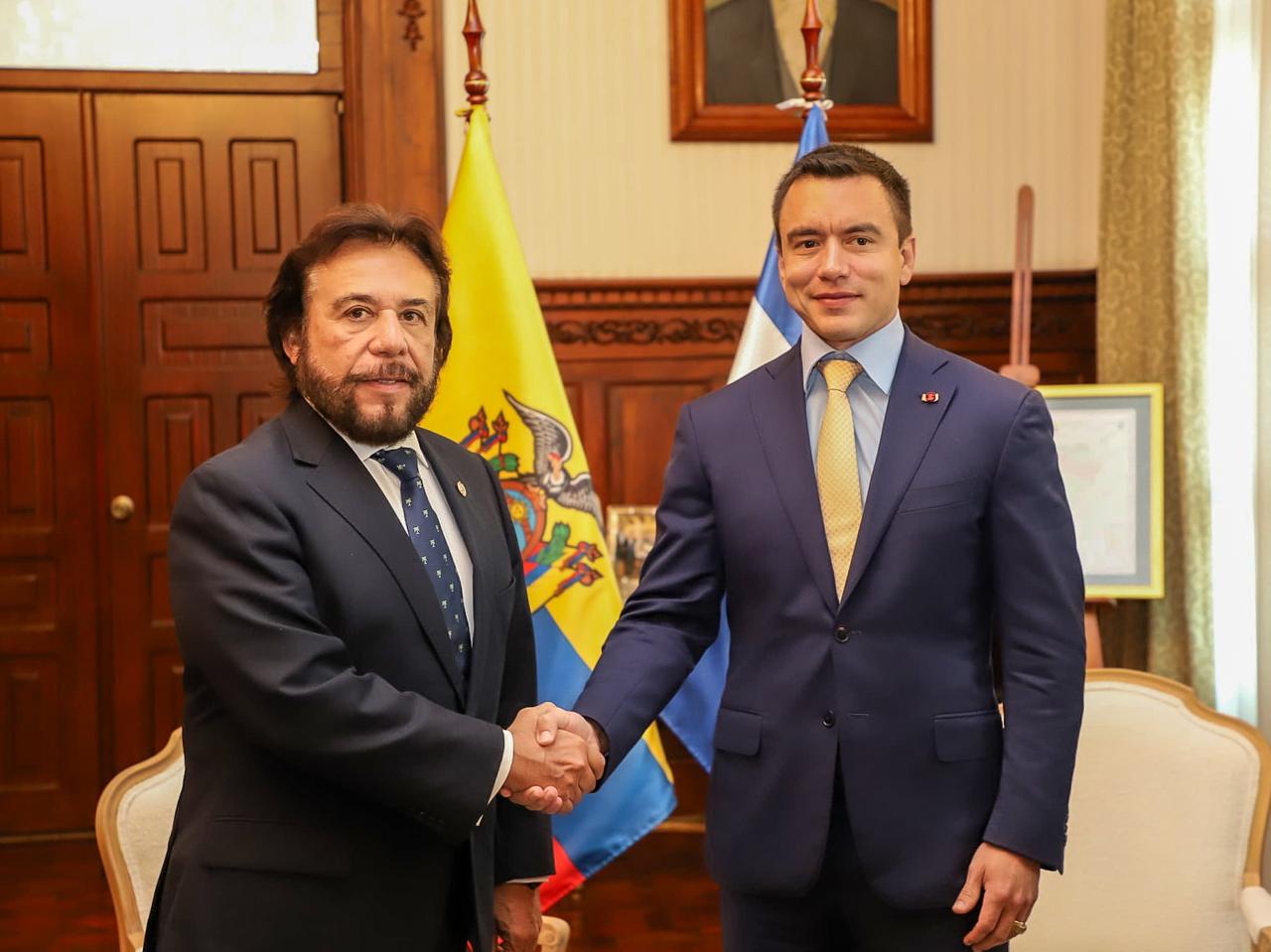 Este jueves, el Vicepresidente de El Salvador, Félix Ulloa, sostuvo una reunión de alto nivel con el Presidente Electo de Ecuador, Daniel Noboa, previo a la ceremonia de posesión de mando presidencial del mandatario suramericano.