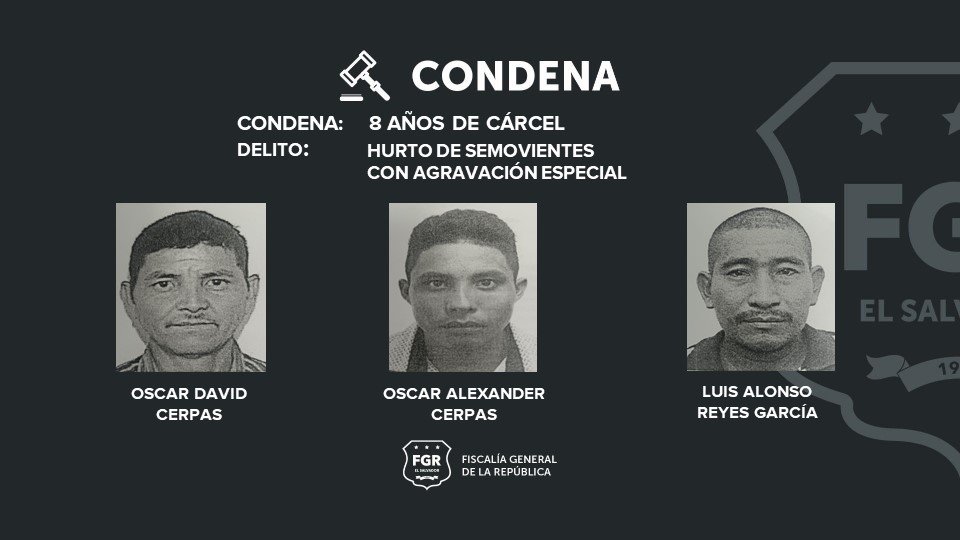 El Juzgado de Sentencia de Zacatecoluca condenó a los incriminados por el delito de hurto de semovientes con agravación especial, y les impuso una pena de 8 años de prisión, a cada uno, y a pagar en concepto de responsabilidad civil un total de $4,900.00 dólares, que corresponde en forma individual a cada sentenciado $1,633.33.